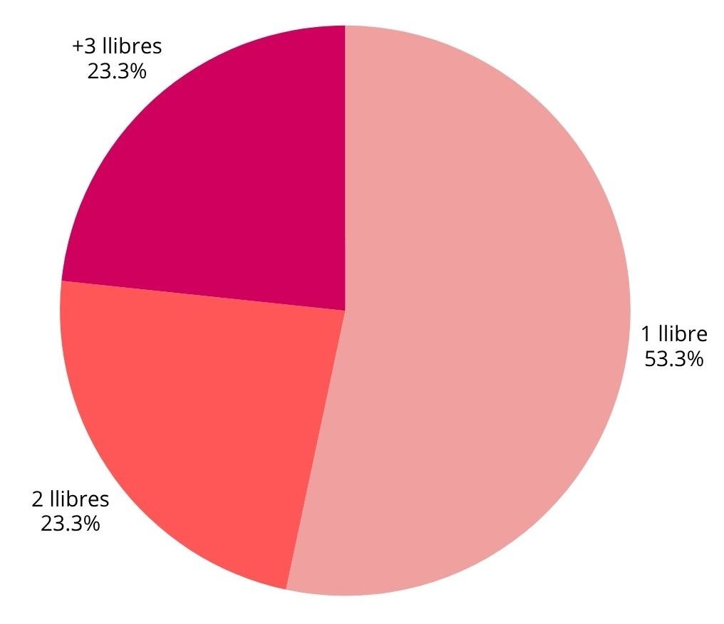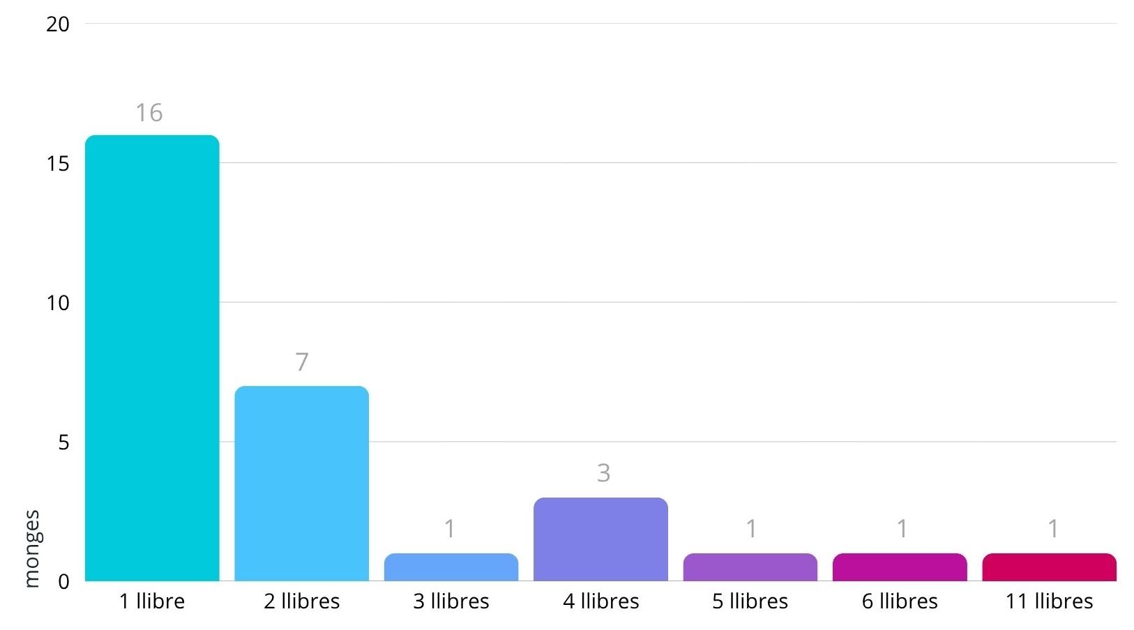 A través dels gràfics es pot constatar com més de la meitat de les monges identificades tan sols disposaven d’un llibre propi, el 76% si hi sumem també les que en tenien dos. I només una reduïda elit —a l’entorn d’un 23%—, disposaven de més de dos exemplars de lectura.